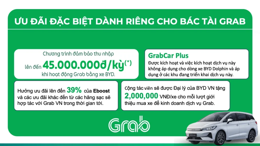 Đặc biệt, BYD còn có chính sách ưu đãi dành riêng cho bác tài GrabCar Plus: hưởng ưu đãi lên đến 39% phí sạc từ Eboost và các đối tác sạc khác.