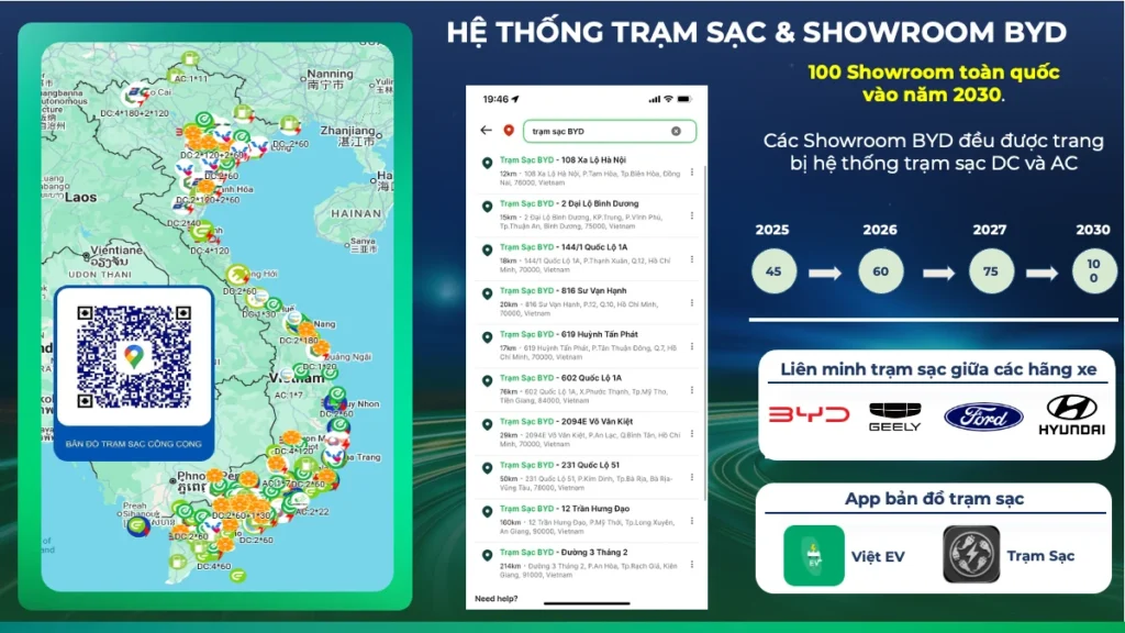 Hệ thống showroom & trạm sạc phủ khắp: 45 showroom tại 23 tỉnh trong năm 2025, hướng tới 100 showroom toàn quốc vào 2030