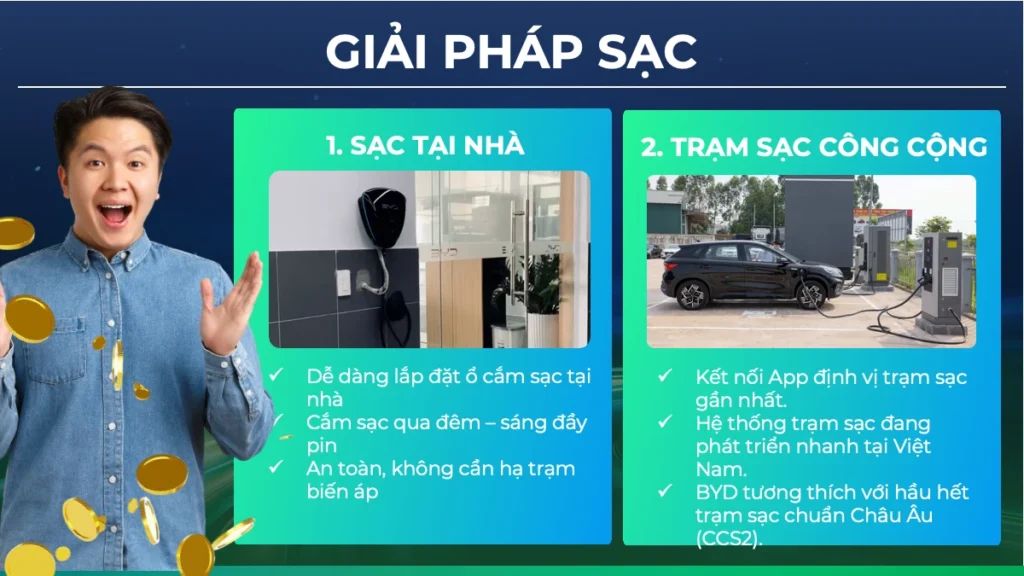 Giải pháp sạc tiện lợi: Bộ sạc tại nhà 7.7 kW miễn phí lắp đặt, kèm bộ sạc cầm tay và V2L – tiện lợi cắm sạc qua đêm, sáng dậy đầy pin.