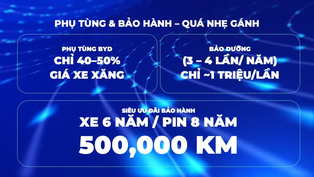 Phụ tùng & hao mòn: Giá chỉ bằng 40–50% so với xe xăng, lại thêm chính sách bảo hành xe 6 năm, pin 8 năm hoặc 500.000 km – nhẹ gánh lo chi phí dài hạn.